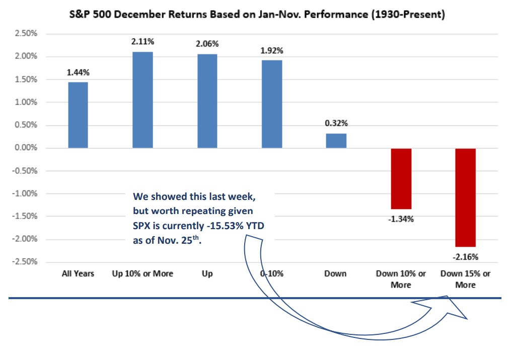 他补充说:“还要提醒的一点是,当标普500指数在整个11月下跌15%或更大幅度时,12月的表现往往也很糟糕。”