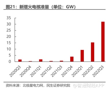但在2021年9月限电频发后,2021年底的中央经济会议中提出:传统能源逐步退出要建立在新能源安全可靠的替代基础上,要立足以煤为主的基本国情,推动煤炭与新能源的优化组合。2021年Q4开始,火电投资规模大幅增加。2021年第四季度装机量比前三季度总和还要高出45.85。2022年火电核准进一步提速1-9月,火电核准量为56.78GW,其中9月核准15GW。