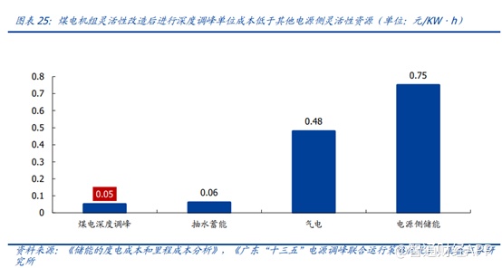 据《储能的度电成本和里程成本分析》以及《广东“十三五”电源调峰联合运行策略优化》,采用煤电深度调峰的单位发电成本为0.05元/度,抽水蓄能的单位发电成本为0.06元/度,采用电源侧储能的单位发电成本为0.75元/度,煤电灵活性改造单位成为最低,且深度调峰的成本也显著低于其他电源侧灵活性资源。