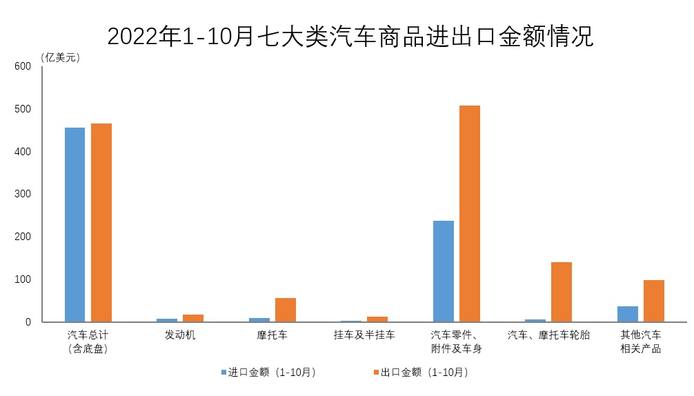 2022年1-10月,全国汽车商品累计进出口总额为2050.6亿美元,同比增长12.3%,增速略高于1-9月。其中进口金额750.7亿美元,同比下降5.8%,降幅比1-9月有所收窄;出口金额1299.9亿美元,同比增长26.2%,增速比1-9月略有提升。