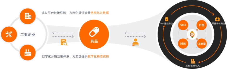 在医药产业互联网的运行逻辑中,平台依托数字技术,从数据链接上下游信息孤岛入手,重构医药流通供应链,打通上游药企缩短流通路径,实现产业各环节和要素数据化,从而优化资源配置,推动业务流程和生产方式变革,提升产业效率。