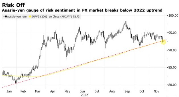 智通财经APP获悉,在人们担心美联储的鹰派立场之际,衡量外汇市场风险情绪的一项关键指标正在发出警告信号。澳元兑日元已跌破今年以来的上行趋势支撑位和200日移动均线,这一突破为进一步下行指明了道路,表明汇市情绪恶化。周一,澳元兑日元暴跌1.6%,原因是交易员对美联储官员强调需要进一步加息做出了反应。鉴于风险敏感的澳元与传统避险货币日元之间的不同,外汇交易员密切关注该破位趋势。