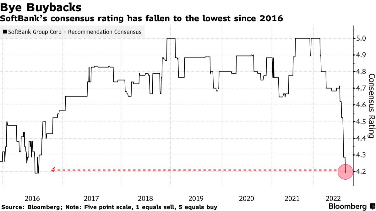 智通财经APP获悉,由于日本科技巨头软银集团(SFTBY.US)在投资持续亏损的情况下,拒绝进行新的股票回购,华尔街多家投行下调了该公司评级。其中,在花旗分析师将软银集团评级从“买入”下调至“中性”后,该股周二一度下跌2.6%。此前,德银、里昂证券、Jefferies等投行也下调了软银集团评级。如今,软银的市场普遍评级已跌至六年来的低点。