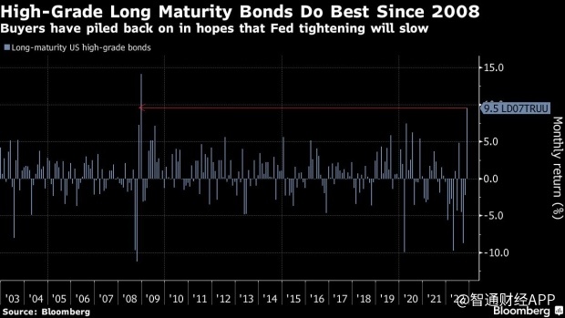 智通财经APP获悉,信贷投资者正重新大举买长期债券,因为他们预期美联储很快就会放慢紧缩的步伐。本月迄今,期限在10年或以上的美国公司债飙升9.5%,有望创下2008年12月以来的最大涨幅。这些债券在2022年暴跌逾24%。