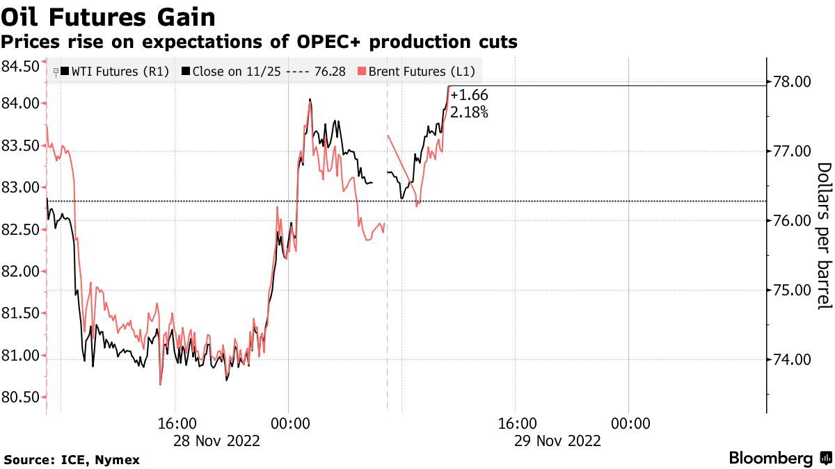 本月油价已下跌约9%,以美联储为代表的各大央行收紧货币政策为全球经济放缓埋下了隐患,并且可能危及能源消费。对市场需求的担忧促使欧佩克+在上个月宣布大幅减产200万桶原油,该组织的代表们现在表示,进一步减产可能是一种选择。在会议召开之前,受到广泛关注的市场指标显示,近期原油供应充足。
