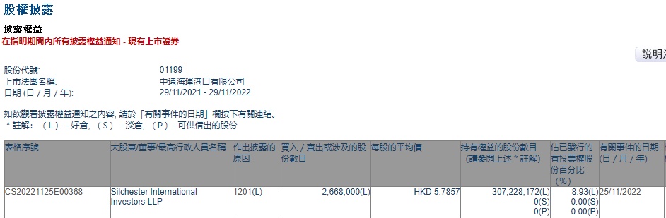 智通财经APP获悉,香港联交所最新资料显示,11月25日,Silchester International Investors LLP减持中远海运港口(01199)266.8万股,每股作价5.7857港元,总金额约为1543.62万港元。减持后最新持股数目约为3.07亿股,最新持股比例为8.93%。