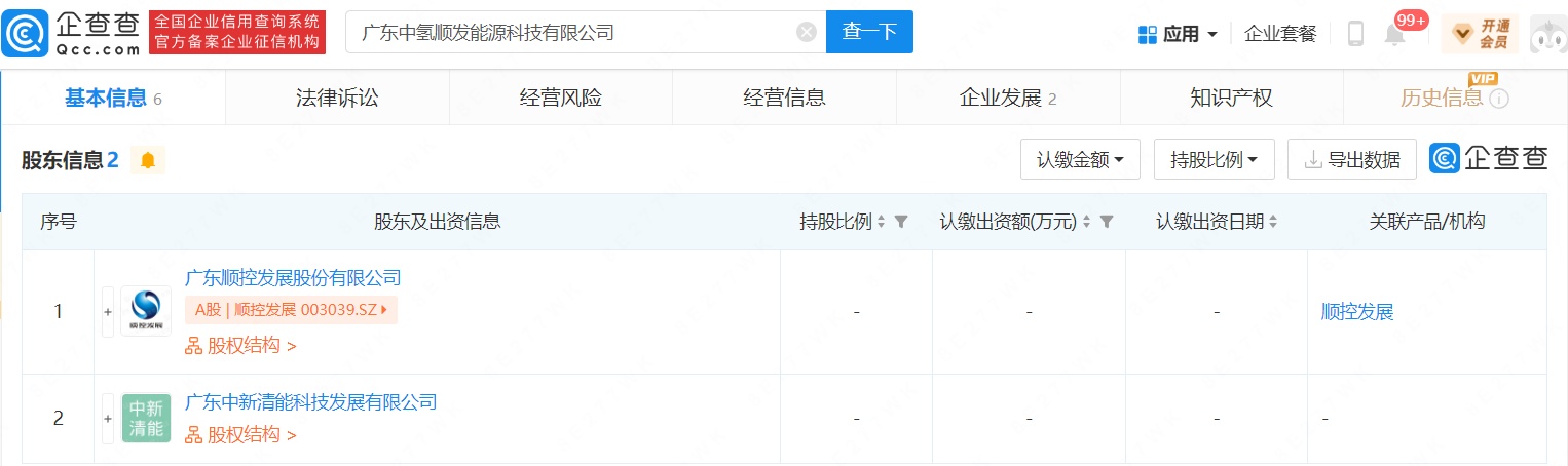 智通财经APP获悉,企查查APP显示,近日,广东中氢顺发能源科技有限公司成立,法定代表人为王德新,注册资本1000万人民币。股东信息显示,该公司由广东中新清能科技发展有限公司、广东顺控发展(003039.SZ)股份有限公司共同持股。