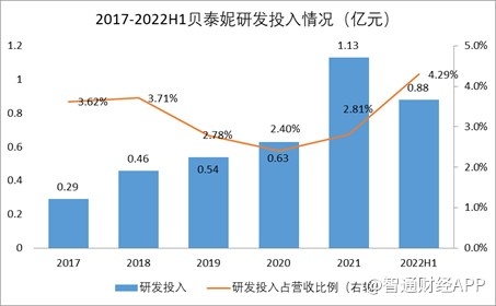 近年来,公司研发投入持续保持超高增长,“硬核”研发属性凸显。据财报披露,贝泰妮2022上半年研发投入达0.88亿元,同比增长85.17%,研发投入占比达到4%以上,创下历年来营收占比的新高。