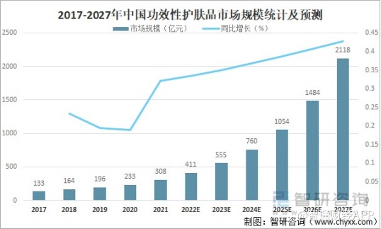 沙利文数据表明,2021年中国功效性护肤品市场规模达308亿元,较2020年增加了75亿元,同比增长32.19%,未来将继续保持增长,预计2027年中国功效性护肤品市场规模将达到2118亿元。