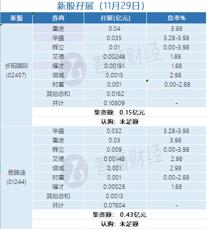 智通财经APP获悉,步阳国际(02457)、思路迪(01244)正在招股中。截至11月29日,辉立、华盛等合计为步阳国际借出孖展 0.10809亿港元,认购未足额;合计为思路迪借出孖展0.07604亿港元,认购未足额。