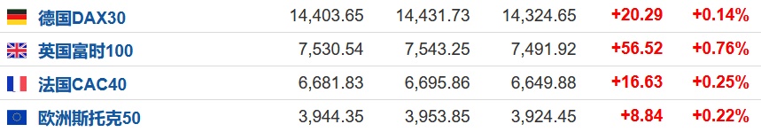 2. 截至发稿,德国DAX指数涨0.14%,英国富时100指数涨0.76%,法国CAC40指数涨0.25%,欧洲斯托克50指数涨0.22%。
