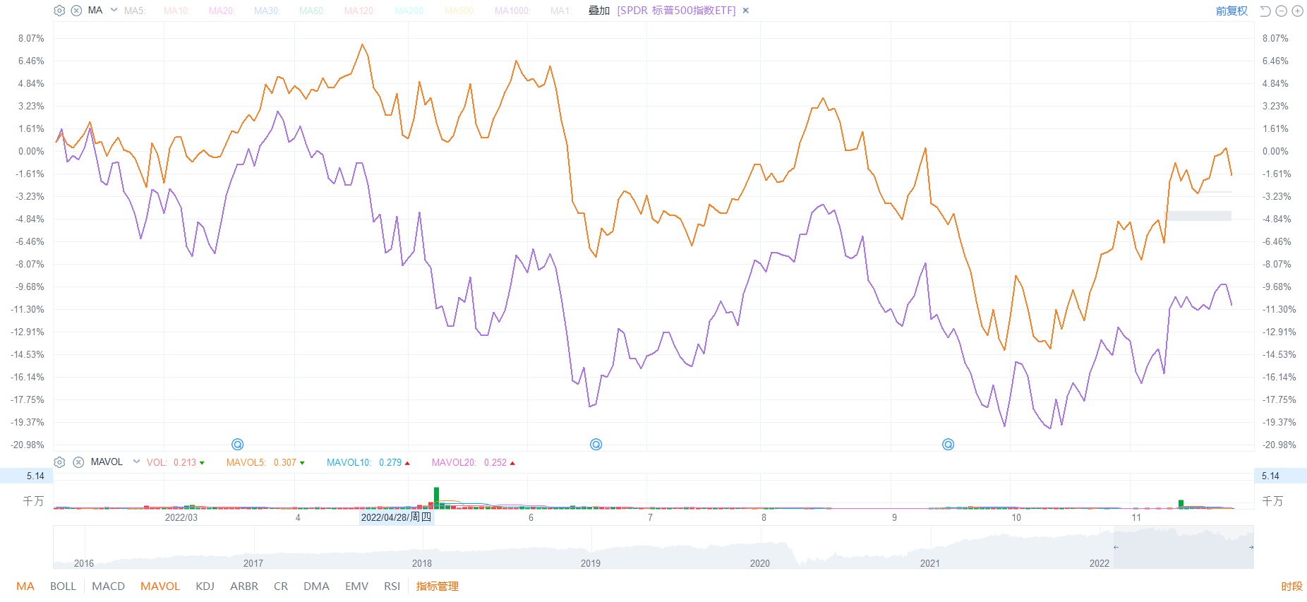 数据显示,衡量标普500高股息板块股表现的SPDR S&P 500 High Dividend ETF(橙色走势图)今年截至11月28日的表现好于同期的标普500指数ETF-SPDR(紫色走势图):