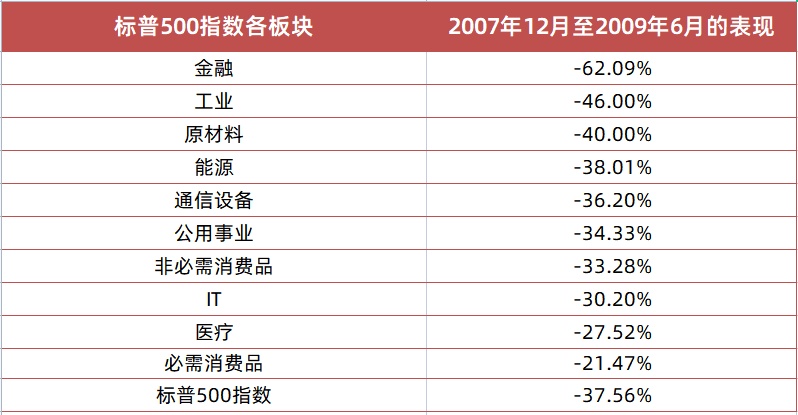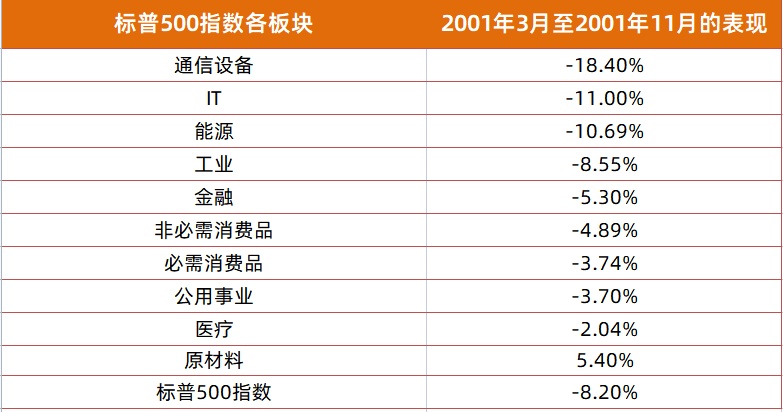 美国在2001年出现了温和的经济衰退,而在2007年因金融危机爆发陷入了深度衰退,且持续时间长,从2007年12月一直持续到2009年6月。在这两次经济衰退期间,美股各板块的表现如下: