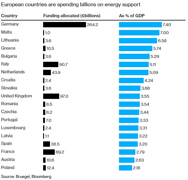 智通财经APP获悉,欧洲为确保能源供应和保护消费者免受价格飙升冲击的支出在11月飙升至7000亿欧元以上。根据欧洲智库Bruegel的数据,自2021年9月以来,欧盟国家已指定并分配了约6000亿欧元的支持资金,以保护消费者免受能源成本飙升的影响,这一数字较上个月的计算结果增加了500亿欧元。此外,英国和挪威则总计提供了1050亿欧元的支持资金。