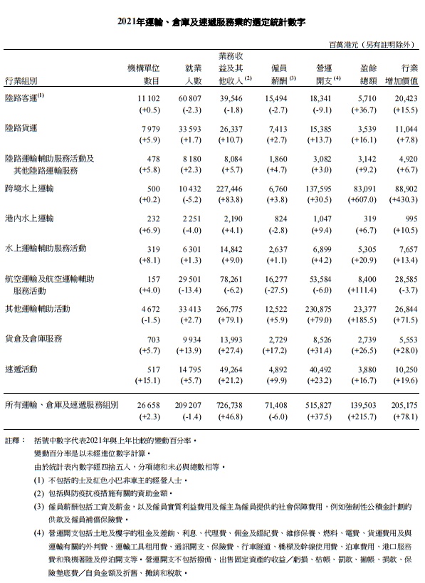 在陆路货运业方面,2021年的总收益为263亿元,而营运开支和雇员薪酬合共为228亿元。盈余总额由2020年的30亿元上升至2021年的35亿元。盈余总额占2021年总收益的13.4%。行业增加价值较2020年上升7.8%至110亿元。