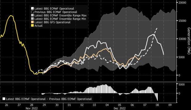 模型显示,英国风电功率将在周二降至580兆瓦左右,并在晚间回升至3920兆瓦左右。相比之下,英国电网的数据显示,11月2日的风电功率为20896兆瓦。风力发电的缺口预计将持续至周四。