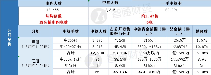 其中,公开配售申购人数13455人,一手中签率80.00%,认购倍数约1.47倍。