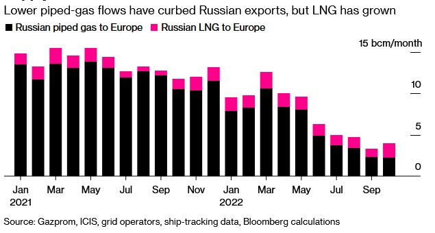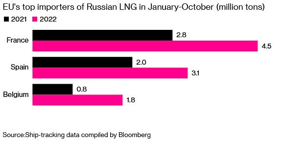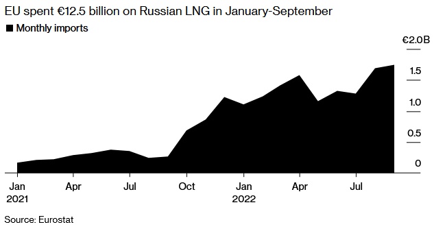 智通财经APP获悉,俄乌冲突以来,欧盟逐渐降低了对俄罗斯能源的依赖,包括禁止从俄罗斯进口煤炭、即将对俄罗斯石油及石油产品实施禁运,以及减少了对俄罗斯管道天然气供应的依赖。但与此同时,欧盟仍依赖俄罗斯液化天然气(LNG),且这一能源在短期内不太可能面临欧盟的抵制。数据显示,今年1至10月,欧洲进口的俄罗斯液化天然气(LNG)较去年同期增长超40%,达到了创纪录的178亿立方米;从1月至9月,欧盟在俄罗斯液化天然气上的花费同样达到了创纪录的125亿欧元(约合130亿美元),是去年同期的五倍。