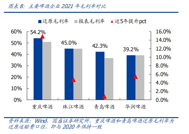然而,规模并不代表利润,华润啤酒产品吨价处于低位。从啤酒销售吨价角度来看,2021年华润啤酒吨酒价仅为3019元/千升,预计与燕京啤酒处于相同水平,青岛啤酒作为行业市占率第二的企业,吨价为3742元/千升,较华润啤酒高23.9%,这主要是由产品结构导致,华润啤酒当前次高及以上产品销量占总销量的16.9%,相较于青啤近年逐渐提高的青岛啤酒品牌占比和珠江啤酒主打的纯生产品仍处低位,这导致华润啤酒的毛利率一直逊色于同行,2021年华润啤酒的毛利率为39.2%,低于重庆啤酒(54.2%)、珠江啤酒(45.0%)和青岛啤酒(42.3%)。