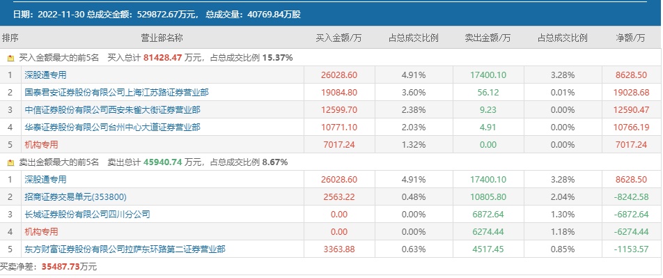具体来看,龙虎榜单上深股通占据了买一、卖一的位置,净买入8628.44万元,占当日成交总额的1.63%。