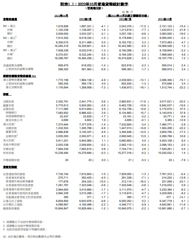 智通财经APP获悉,11月30日,香港金融管理局发布2022年10月份货币统计数字。数据显示,10月份港元货币供应量M2及M3同时下跌1.3%,与去年同期比较均下跌2.2%。10月份经季节因素调整的港元货币供应量M1下跌4.9%,与去年同期比较下跌15.1%,部分反映投资相关活动。货币供应量总额M2及M3于10月份均下跌0.4%,与去年同期比较,M2及M3均上升1.2%。