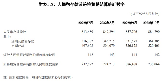 2022年10月份认可机构的存款总额下跌0.3%。其中港元存款下跌1.4%,外币存款则上升0.8%,主要反映企业资金流动。由年初截至10月底计,存款总额上升0.4%,港元存款则下跌1.9%。香港人民币存款在10月份上升3.2%,于10月底为8,848亿元人民币。跨境贸易结算的人民币汇款总额于10月份为7,381亿元人民币,而9月份为8,865亿元人民币。存款变动受多项因素影响,包括利率走势、市场集资活动等,因此适宜观察较长期趋势,毋须过度解读个别月份的波动。