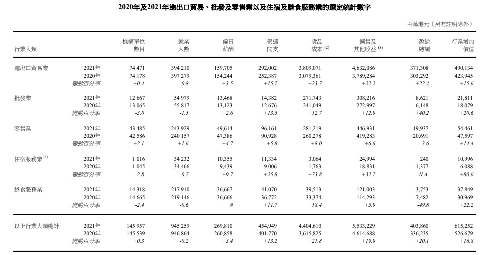 在零售业方面,2021年的总收益为4469亿元,而营运开支、货品成本及雇员薪酬合共为4270亿元。盈余总额由2020年的207亿元下跌至2021年的199亿元,而2021年的盈余总额占总收益的4.5%。行业增加价值同比上升14.4%至545亿元。