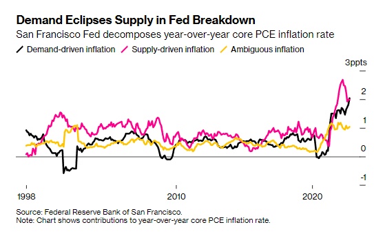 根据美联储经济学家建立的新衡量标准,商品和服务的强劲需求可能正开始超过疫情和俄乌冲突造成的供应限制,成为推动美国物价的重要因素。