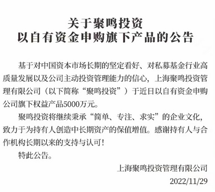 智通财经APP获悉,11月30日,国内知名百亿私募聚鸣投资公告称,基于对中国资本市场的坚定看好、对私募基金行业高质量发展以及公司主动投资管理能力的信心,聚鸣投资近日以自有资金申购公司旗下权益产品5000万元。