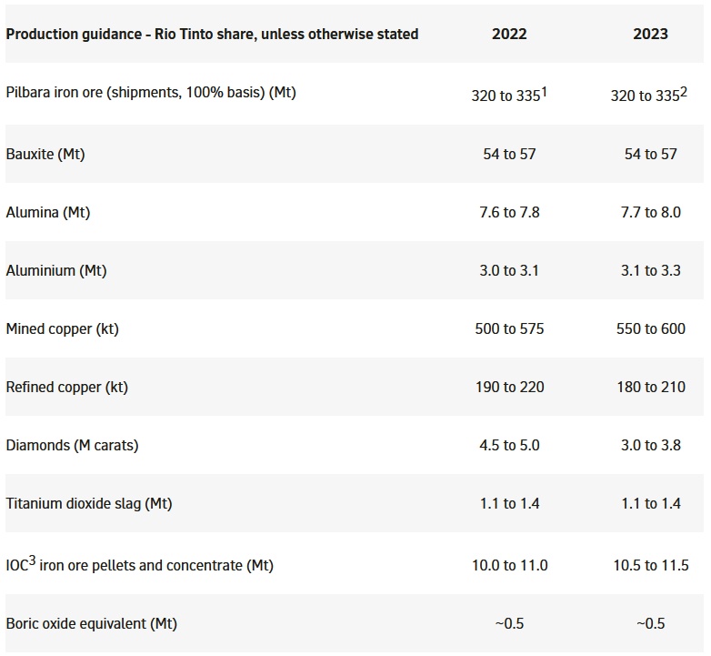 此外,力拓还预计,2023年铝产量为310万-330万吨,高于2022年的300万-310万吨;2023年精炼铜的产量预计为18万-21万吨,低于2022年的19万-22万吨。力拓还表示,预计2023年钻石产量将从2022年的450万-500万克拉降至300万-380万克拉。