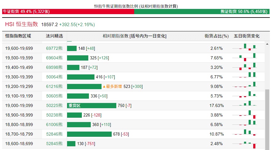 法兴恒指牛熊证街货分布图中的数据显示,熊证街货重货区在19000-19099区间,该区间最新熊证数量为750张,较上一交易日减少7张;最多新增在19200-19299区间,该区间最新熊证数量为523张,较上一交易日增加300张。