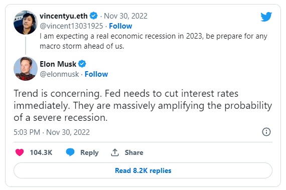 电动汽车新闻网站Tesmanian的联合创始人在推特上表示,他预计美国将于2023年出现真正的经济衰退,应该为宏观风暴做好准备。