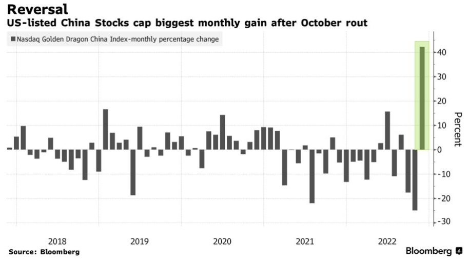 而在11月,市场对中概股的信心得到显著改善,因为投资者看到了与中国经济重开趋势、对房地产行业的政策支持力度加大,以及中国一些最大的科技公司在估值仍然低迷的情况下公布强劲的季度业绩等更多确定性因素。