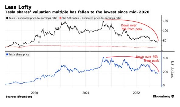 特斯拉的股价在2021年11月初达到历史高点后,一直受到利率上调的拖累,加息打击了成长型股票的估值,以及新冠疫情一直在困扰全球经济的问题。