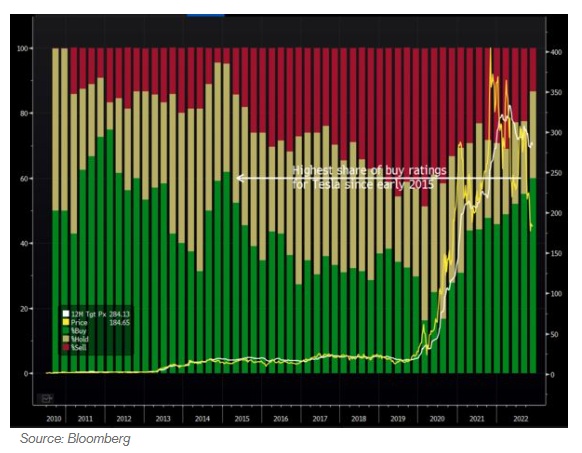 但下跌的规模已让证券分析师越来越看好特斯拉,他们认为抛售已经走得太远。数据显示,超过60%的分析师现在建议投资者购买特斯拉股票,这是自2015年初以来的最高比例。
