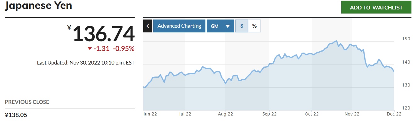 在11月,美元兑日元汇率下跌达7.15%,为14年来表现最差的一个月,主要因外汇交易员们押注美联储调整紧缩步伐,一些交易员甚至押注在衰退预期下美联储即将改变“鹰派”政策立场,即下半年转向降息。