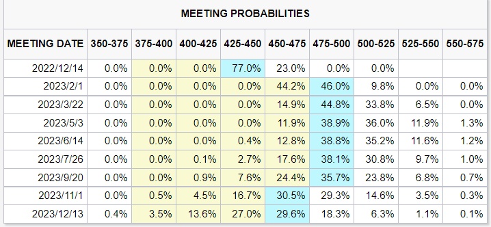 利率期货市场预期数据显示,美联储于美东时间12月14日将加息步伐放缓至50个基点的概率一度接近90%(目前为77%),加息75个基点的概率一度仅为不到10%。在美联储本轮加息周期背景下,利率期货市场对利率峰值的预期由此前的5%-5.25%降温至4.75%-5%。