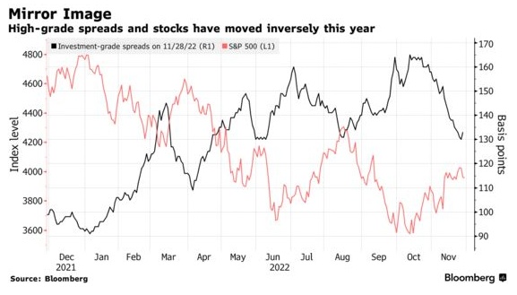 最近几周,随着股市反弹,高等级债券和垃圾债券的息差双双缩小,市场预期美联储将很快放慢紧缩步伐。尽管标准普尔500指数在2022年仍下跌逾17%,但过去两个月已上涨约10%。