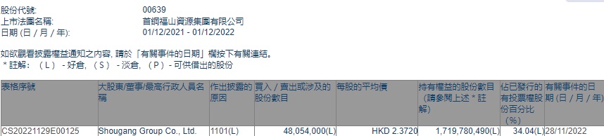 智通财经APP获悉,香港联交所最新资料显示,11月28日,Shougang Group Co., Ltd.增持首钢资源(00639)4805.40万股,每股作价2.372港元,总金额约为1.14亿港元。增持后最新持股数目约为17.20亿股,最新持股比例为34.04%。