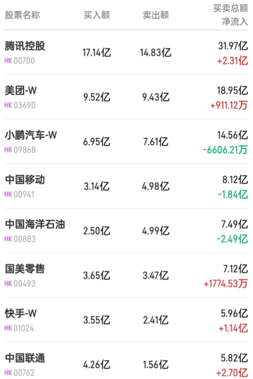 中国联通(00762)获净买入2.7亿港元。消息面上,银河证券指出,运营商作为通信板块龙头,随着业绩的持续向好,估值体系有望重构,未来成长空间广阔。业务布局方面,随着我国5G基建的逐步推进,三大运营商的业务布局逐步从此前的5G建设转向5G应用发展及云计算方面,市场空间增大;同时与互联网公司的合作共赢也带来了业绩高速增长预期。值得一提的是,同属电信股的中国移动(00941)遭净卖出4609万港元。