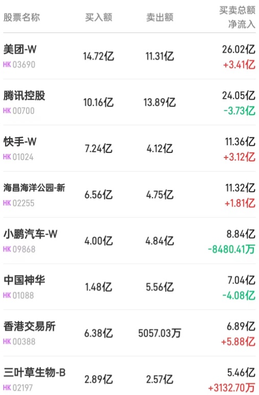 北水净买入最多的个股是港交所(00388)、快手-W(01024)、美团-W(03690)。北水净卖出最多的个股是中国神华(01088)、中海油(00883)、小鹏汽车-W(09868)。