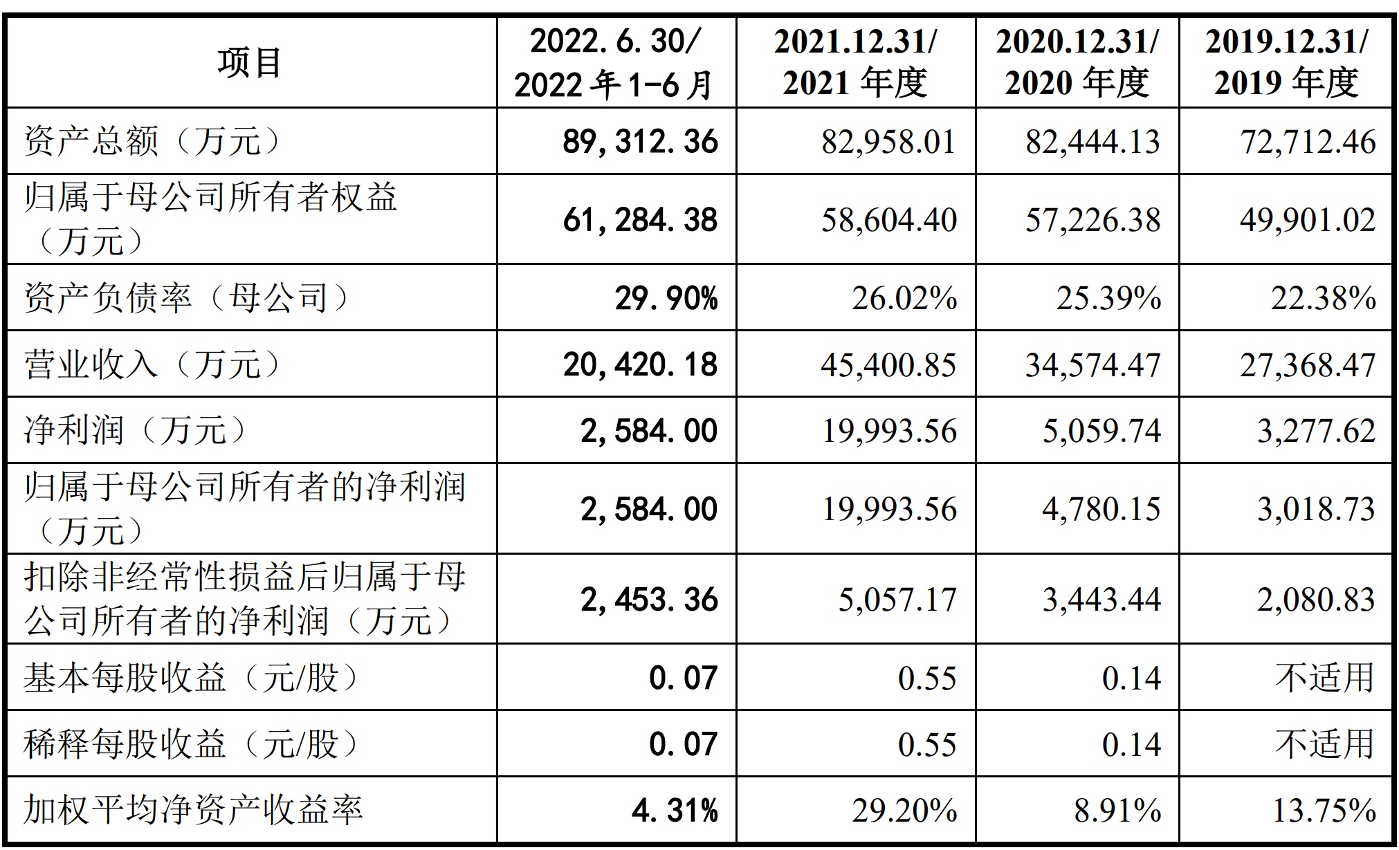 业绩方面,2019年度、2020年度、2021年度及2022年上半年,公司分别实现营业收入2.74亿元、3.46亿元、4.54亿元和2.04亿元,净利润3277.62万元、5059.74万元、2亿元和2584万元。