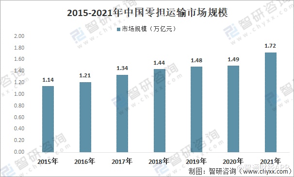 目前,国内零担运输行业整体处于整合提速期,市场集中度不高,竞争者众多。据智研咨询数据,2020年受疫情影响,市场规模增速有所放缓;2021年随着经济复苏,物流行业有所恢复,市场规模大幅增长至约1.72万亿元。
