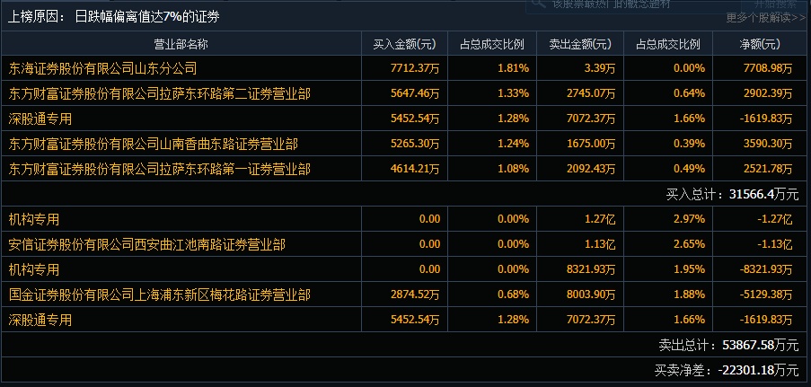 智通财经APP获悉,12月1日,新冠药物板块出现集体大跌,其中众生药业(002317.SZ)跌停,报33.89元,成交额42.58亿元,换手率17.63%。今日,众生药业因属于当日跌幅偏离值达7%而登上龙虎榜,此次是近5个交易日内第1次上榜。深交所披露盘后交易信息显示,众生药业遭两机构合计卖出2.1亿元。