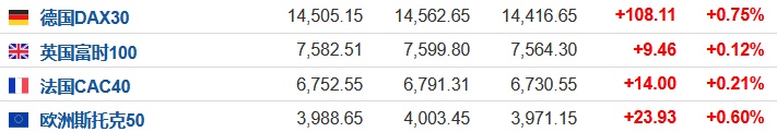 2. 截至发稿,德国DAX指数涨0.75%,英国富时100指数涨0.12%,法国CAC40指数涨0.21%,欧洲斯托克50指数涨0.60%。