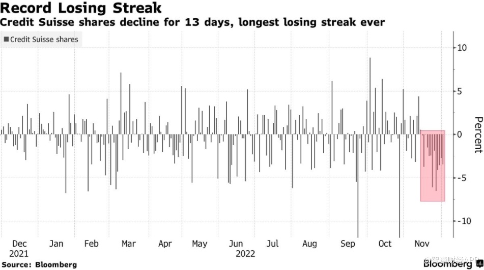 自11月23日以来,瑞信股价已下跌约21%,当时瑞信报告其关键的财富管理业务出现大规模资金外流,并警告称第四季度可能再次出现巨额亏损,亏损或高达15亿瑞士法郎(合16亿美元)。