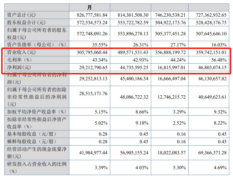财务方面,2019年、2020年、2021年及2022年上半年,康比特分别取得营收约为3.60亿元、3.57亿元、4.90亿元、3.06亿元,毛利率分别为56.48%、44.24%、42.93%、43.34%;同一时期,公司净利润分别约为4680.31万元、1681.60万元、4473.56万元、2921.28万元。