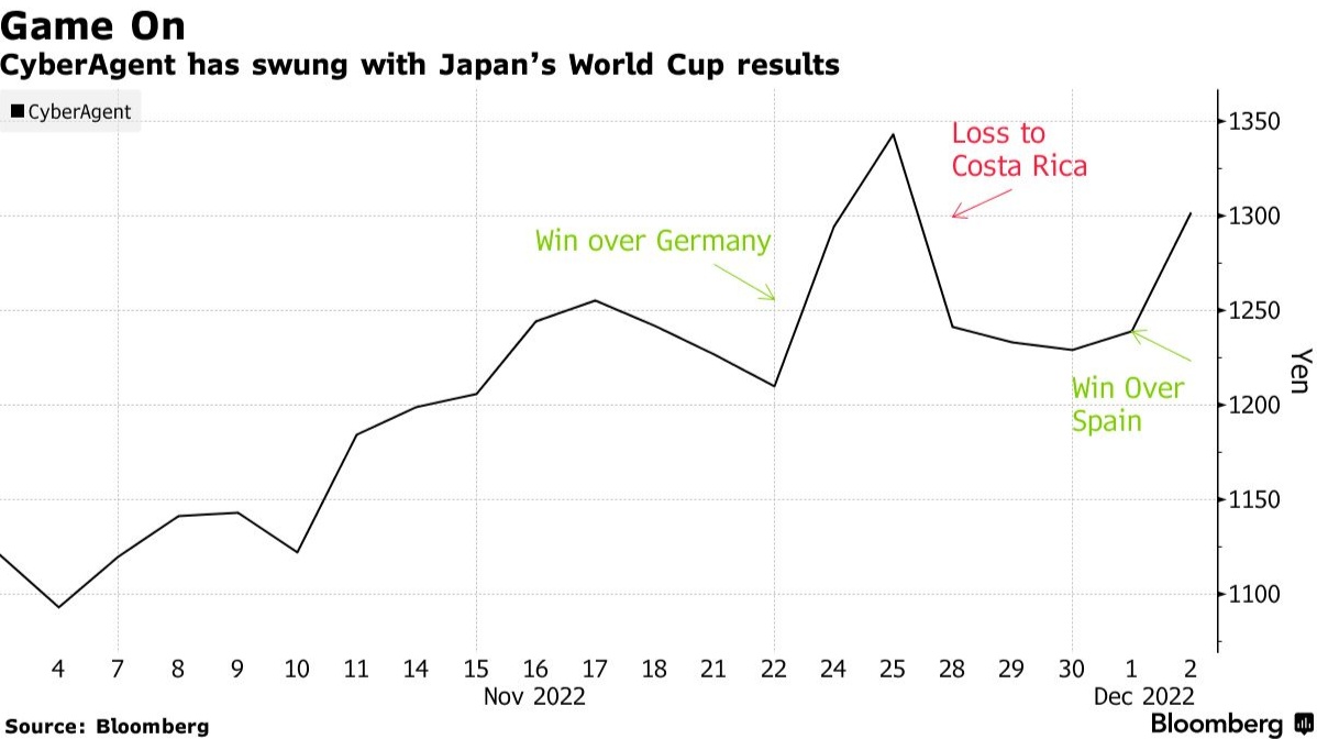 智通财经APP获悉,在日本爆冷击败西班牙晋级卡塔尔世界杯下一轮比赛后,日本的一些体育和娱乐相关股票上涨。其中,CyberAgent Inc.股价飙升7.3%,该公司通过其流媒体服务Abema在日本免费播放所有比赛。此外,体育用品制造商Mizuno