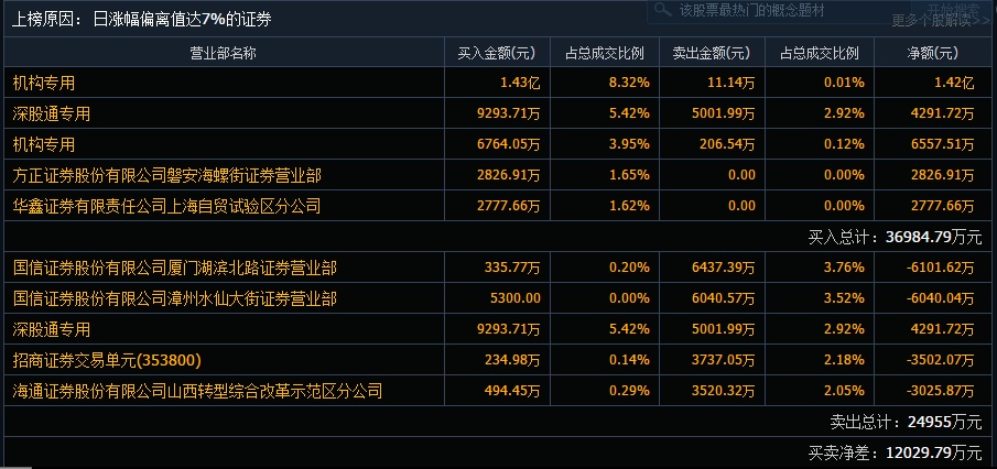 卖出方面,国信证券股份有限公司厦门湖滨北路证券营业部、国信证券股份有限公司漳州水仙大街证券营业部、深股通专用席位、招商证券交易单元、海通证券股份有限公司山西转型综合改革示范区分公司分别卖出6437.39万元、6040.57万元、5001.99万元、3737.05万元、3520.32万元。前5席位合计卖出2.50亿元。
