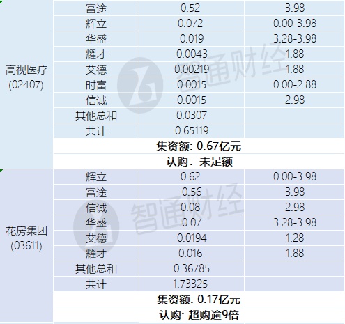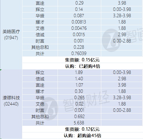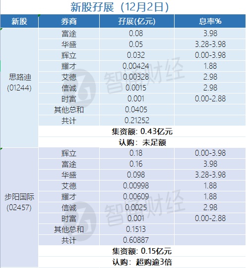 智通财经APP获悉,思路迪(01244)、步阳国际(02457)、美皓医疗(01947)、濠暻科技(02440)、高视医疗(02407)、花房集团(03611)正在招股中。截至12月2日,辉立、华盛等合计为思路迪借出孖展0.21252亿港元,认购未足额;合计为步阳国际借出孖展0.60887亿港元,超认购逾3倍;合计为美皓医疗借出孖展0.76039亿港元,认购已超购4倍;合计为濠暻科技借出孖展5.638亿港元,超认购逾45倍;合计为高视医疗借出孖展0.65119亿港元,认购未足额;合计为花房集团借出孖展1.73325亿港元,超认购逾9倍。